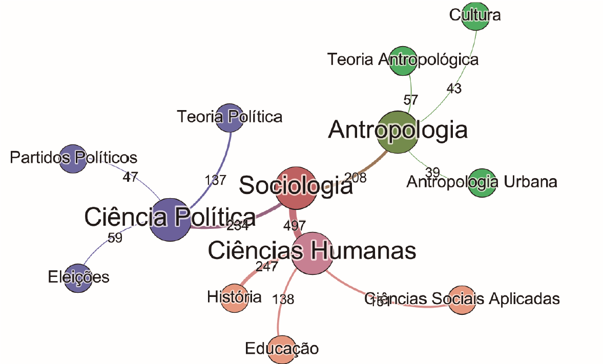 O gráfico não só chama a atenção para o caráter interdisciplinar da área de “pensamento social”, algo mencionado em todos os seus balanços, mas também para a centralidade da sociologia no interior deste universo, a qual figura como o “nó” central. Em termos de associações entre as áreas, vemos que há relações relativamente equilibradas entre a sociologia e as demais disciplinas[20]: há 234 pesquisadores relacionando a sociologia com a ciência política, 247 relacionando-a com a história (mediada pela grande área ciências humanas) e 208, com a antropologia. Esta rede demonstra que, em que pese a centralidade da sociologia – o que certamente traz implicações para a dinâmica teórica, metodológica e empírica desta área de pesquisa[21] –, o “pensamento social” é fortemente interdisciplinar e relativamente equilibrado entre as três disciplinas das ciências sociais e a história.
