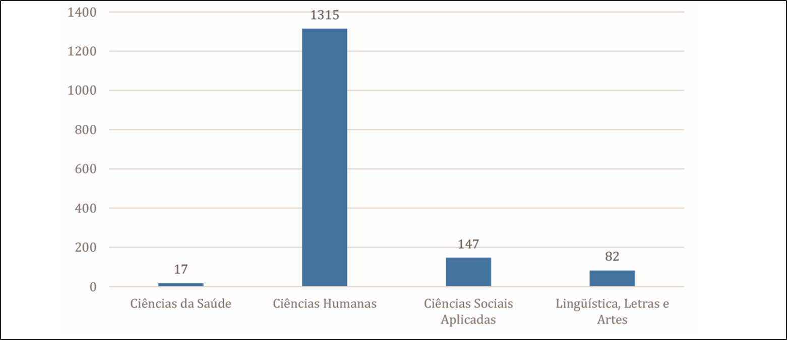 Vemos, no gráfico acima, que a maior parte das produções sobre a América Latina pertence à área das ciências humanas (que inclui Antropologia, Ciência Política, Educação, História e Sociologia, entre outras), com 1315 produções, seguida por ciências sociais aplicadas, com 147, e linguística, letras e artes, com 82 produções; o que é resultado do fato de que nossa cesta de pesquisadores foi extraída a partir do termo “pensamento social”, o que tende a sobresselecionar pesquisadores das ciências humanas. Isso ressalta a diferença em relação aos Estados Unidos, não só porque, no caso, quase todas as ciências sociais, com exceção da história, seriam consideradas “aplicadas”, mas sobretudo porque, inclusive a despeito da mencionada crise do cânone literário, a importância do estudo de línguas, literaturas e culturas estrangeiras e da linguística tornou-se cada vez mais fundamental para os programas de estudos latino-americanos[24].