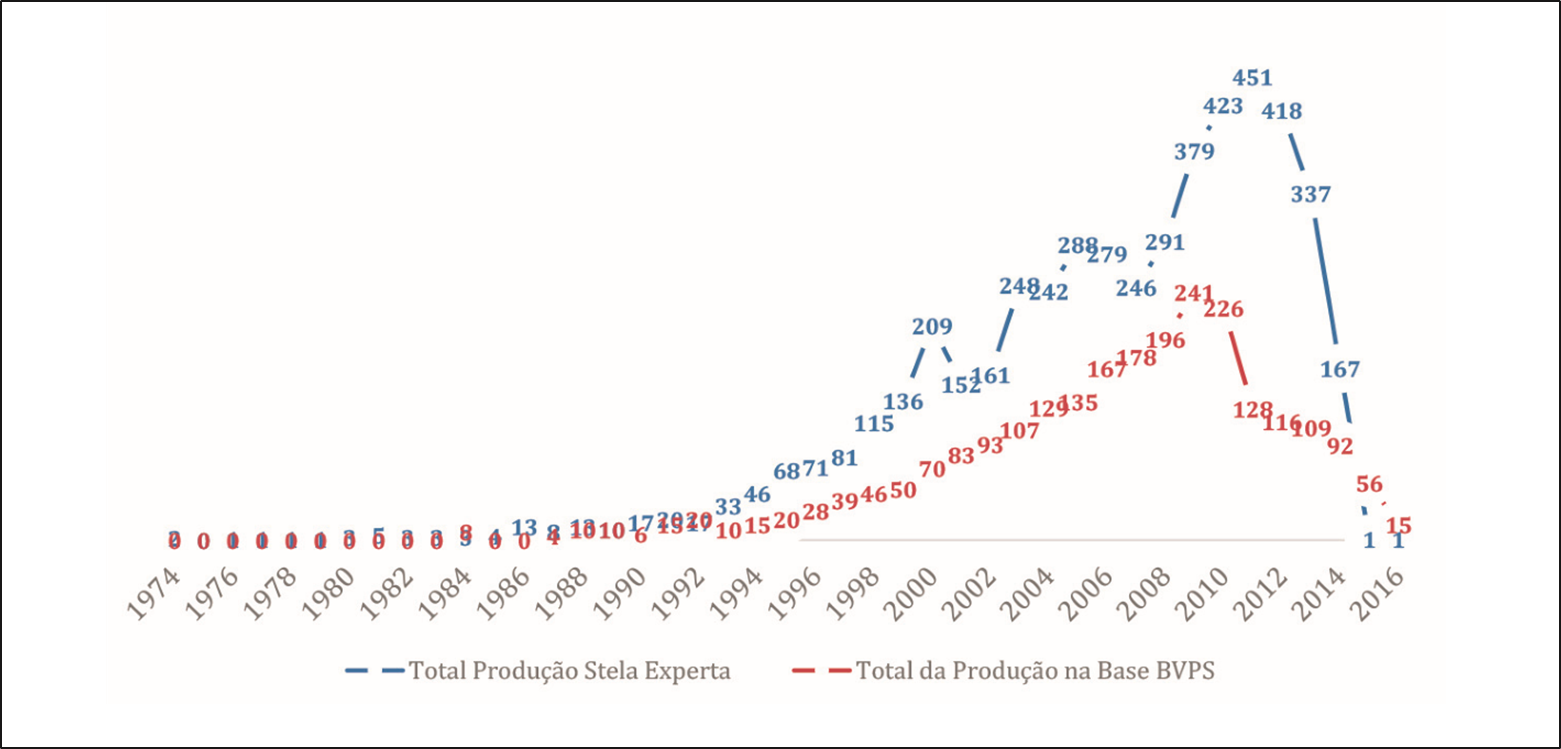 Além dos dados extraídos pela Stela Experta, já contamos com uma massa considerável de itens de produção intelectual indexados na base de dados da BVPS, conforme pode ser acessada em seu site[25]. A construção desta base de dados é diferente do modo como foi extraído o universo dos 938 pesquisadores antes explorado, pois esta depende de uma alimentação demorada e da disponibilidade do texto completo online. Além disso, a identificação dos itens relativos à base BVPS mobilizou estratégias mistas, que envolveram o uso de palavras-chave afins à área de “pensamento social”[26] e a busca de determinados intérpretes que estão contemplados na página principal da BVPS, cuja lista está em permanente processo de expansão[27]. Comparando-se os itens de produção intelectual identificados pela Stela Experta e os documentos indexados na base BVPS, chegamos ao gráfico abaixo, que indica uma trajetória de crescimento da área consistente nos dois métodos de extração de informações.