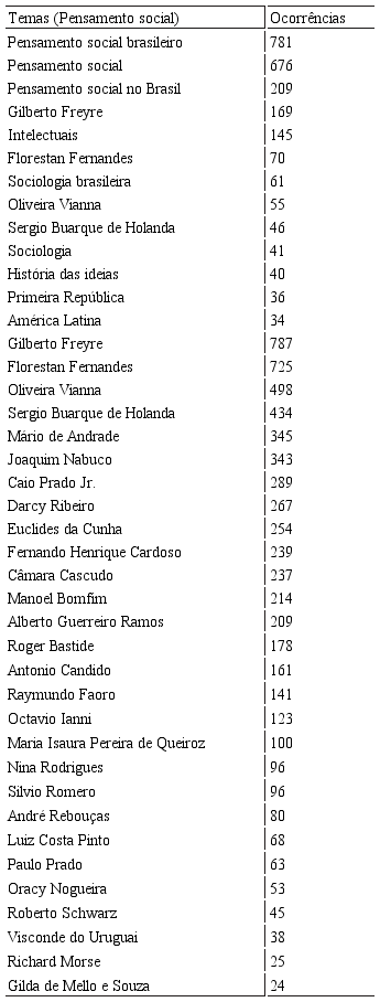 Em números absolutos, selecionando todas as produções destes 938 pesquisadores que contenham o termo “pensamento social”, encontramos os temas mais recorrentes nesta produção (definidos a partir da extração de informações contidas nos CV-Lattes, e não da leitura dos itens de produção)[22]. A fim de qualificar melhor as informações referidas aos “intérpretes do Brasil” mais recorrentes neste universo, pesquisamos também especificamente os nomes dos autores contemplados na coletânea Um enigma chamado Brasil (2009), organizado por André Botelho e Lilia Schwarcz durante sua coordenação do Grupo de Trabalho “Pensamento Social no Brasil” na ANPOCS. A escolha desse livro justifica-se pelo fato de que ele surge como produto das discussões da área em pensamento social no Brasil no interior do GT da ANPOCS, reunindo aproximadamente os intérpretes mais mapeados por essa área de conhecimento desde a década de 1980, quando o GT foi criado.