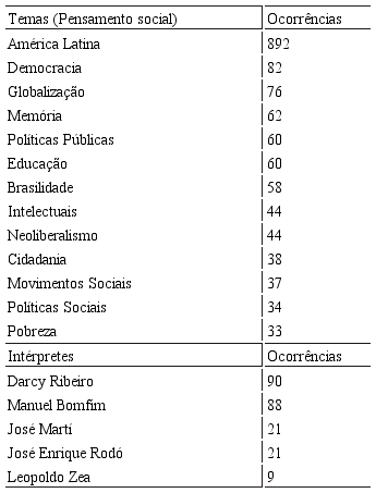 Do quadro, destacam-se algumas questões: por um lado, a predominância de temas ligados à elaboração de políticas públicas (como “Políticas sociais”, “Pobreza”, “Políticas Públicas”, “Democracia”, “Cidadania”, “Movimentos Sociais”), o que revela um regime de politização ligado à relação entre os poderes públicos e a cidadania. Por outro lado, é importante assinalar a presença de termos característicos do contexto histórico-político latino-americano da pós-ditadura (como “Neoliberalismo” e “Memória”) e de outros que chamam a atenção para o próprio processo de internacionalização das ciências sociais (como “globalização”, “brasilidade” e o próprio “América Latina”). Quanto aos intérpretes estudados, vemos a presença de autores fundadores do latino-americanismo moderno, originários de diferentes países e períodos, como o cubano José Martí, o uruguaio José Enrique Rodó e o mexicano Leopoldo Zea, mas, sobretudo, a predominância dos dois brasileiros que talvez mais influíram na constituição de um discurso sobre a América Latina no Brasil: Darcy Ribeiro e Manuel Bomfim.