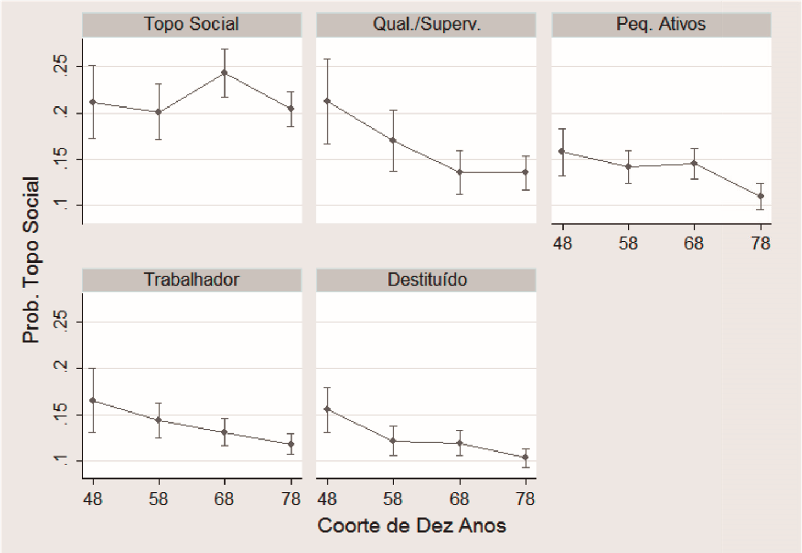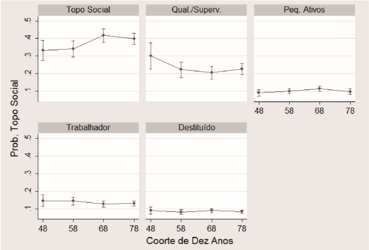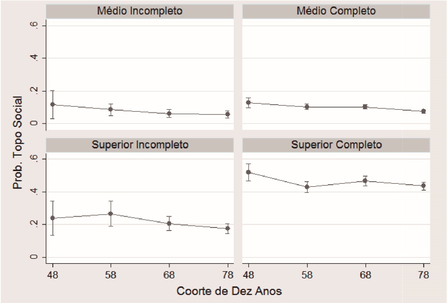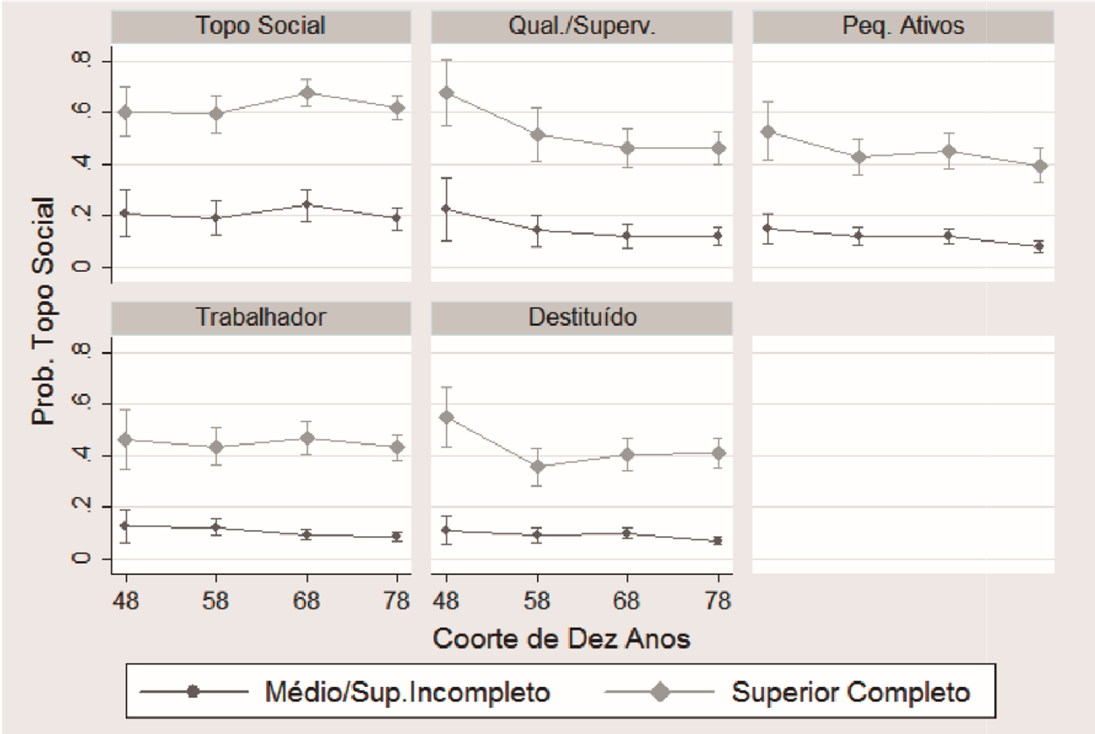 Quando alguém não adquire uma vantagem educacional ou fracassa na escolaridade apesar de ter origem no topo social, ainda assim a origem atua no sentido de favorecer o acesso ao topo social em comparação aos demais grupos. Tendo nível menor de escolaridade (média incompleta, fundamental ou inferior), a diferença da origem topo social versus destituído é de 9,0 pontos percentuais, e, tendo educação média completa/superior incompleta, a diferença é de 11,8 pontos no acesso ao topo. A origem no topo gera uma “vantagem compensatória” capaz, em alguma medida (probabilidade predita de 11,7%), de garantir um lugar no topo para aqueles que não conseguiram obter melhor educação. Beneficiam-se desta proteção da origem de classe os 15,7% vindos do topo social no agregado das coortes que atingiram somente a escolaridade média incompleta ou inferior.