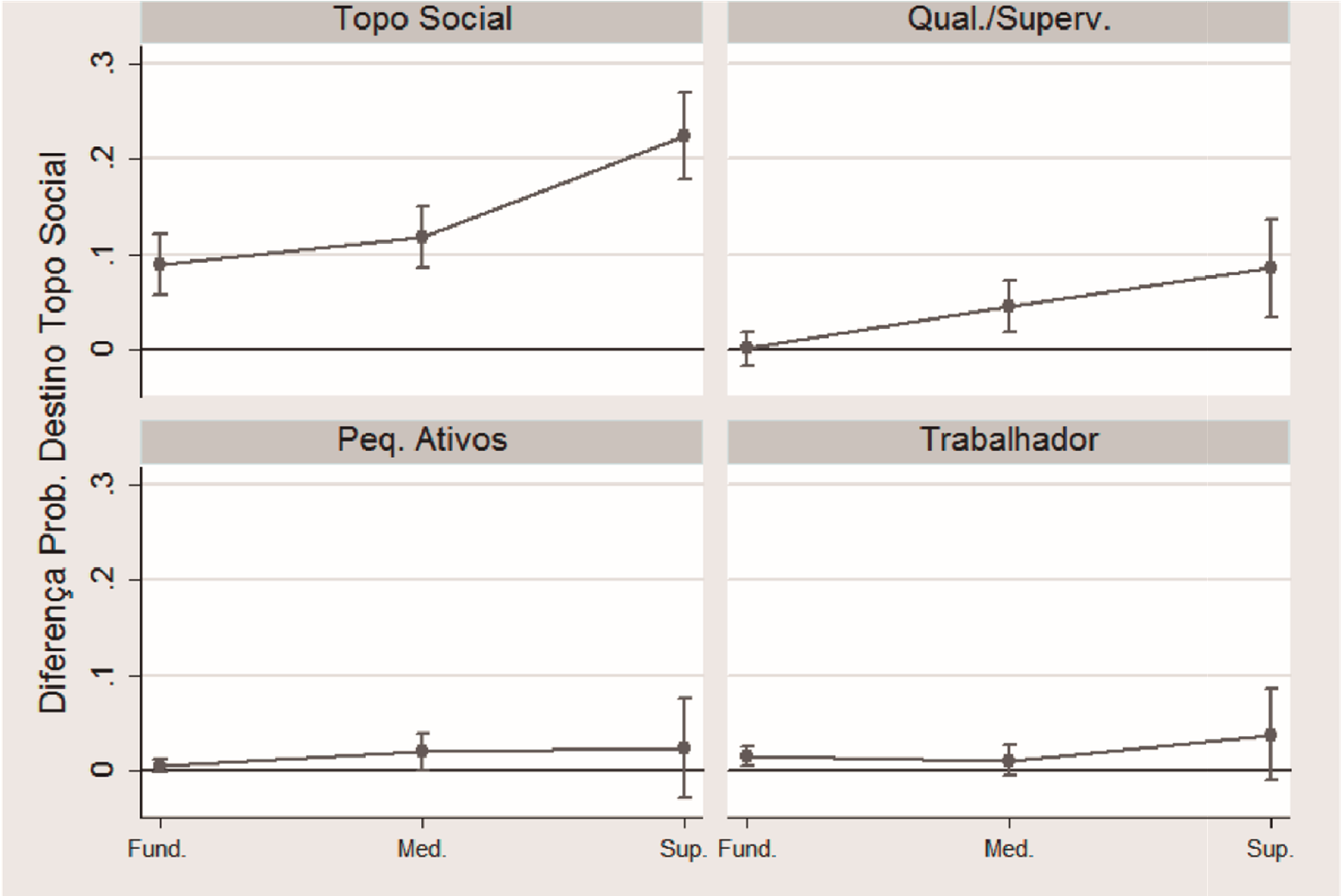 Ao mensurar o topo social sem o pequeno empregador, as estimativas mostram decréscimos nas diferenças entre as origens no topo versus destituído, especialmente nos níveis de escolaridade abaixo do superior completo. No menor nível de escolaridade, a diferença cai de 9,0 (estimativa original) para 3,0 pontos percentuais (pequeno capital fora do topo). O contraste entre as duas estimativas revela que, quando a competição por um lugar no topo social envolve a posse de pequeno capital, o êxito se torna mais problemático para esta origem e/ou mais favorável para a outra. Para quem atinge a educação superior existe uma diferença de 18,6 pontos percentuais entre os dois polos de origem. A origem privilegiada continua a potencializar o efeito da educação superior mesmo quando o destino no topo exclui os pequenos empregadores.