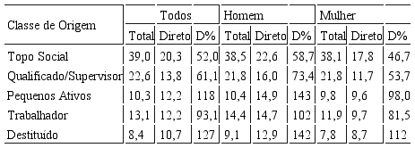 São apresentadas na Tabela 1 as probabilidades preditas de acesso ao topo social com o modelo básico sem e com o controle adicional da educação dos filhos. O modelo básico controla por gênero, cor, idade e Unidade da Federação (UF) onde o filho morava aos 15 anos. O efeito total da origem de classe mostra-se bastante forte (39%) nos agrupamentos de classe mais vantajosos. O efeito total representa uma síntese das múltiplas vantagens ou desvantagens de trajetória associadas à classe de origem. Para alguém com origem no topo social, o efeito direto, independente da educação, corresponde à persistência de uma probabilidade de 20,3% em termos absolutos e de 52% em termos relativos, ou seja, dividindo o efeito direto pelo efeito total. No bloco formado pelo empregado qualificado e supervisor, a persistência relativa do efeito é ainda maior. O efeito direto retrata a capacidade da origem de classe de criar ou limitar as oportunidades para os filhos sem depender estritamente da aquisição e condição educacional. O peso do efeito direto da origem social tem como corolário a limitação do papel da mediação educacional.