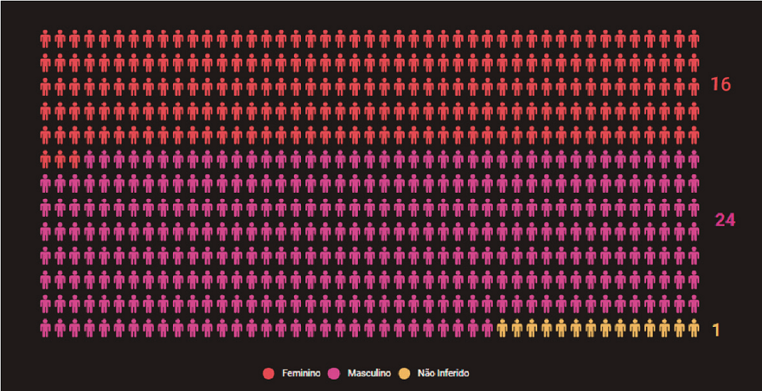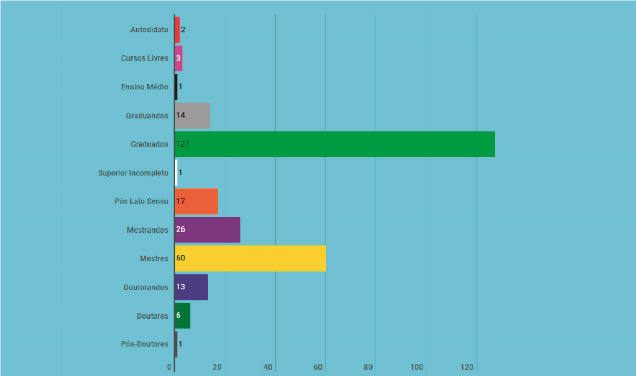 Em relação ao perfil, o levantamento de dados permitiu concluir que os jovens artistas selecionados/as/xs e premiados/as/xs pelos eventos artísticos analisados tinham idades entre 25 e 35 anos (Gráfico 1); estavam concentrados nas cidades do Rio de Janeiro e de São Paulo[8] (Gráficos 2, 3 e 4); possuíam alto grau de escolaridade, sendo, em sua maioria, pelo menos graduados (Gráfico 5); e, permitiu concluir que havia mais homens do que mulheres entre os artistas (Gráfico 6). Esse perfil é uma forma de compreender quem são os/as/xs jovens artistas da arte contemporânea brasileira que estão obtendo acesso às exposições, às residências e ao prêmio analisados, angariando, portanto, a visibilidade que permite a construção de suas carreiras. Mesmo sem uma regular especificação nos editais relativamente ao perfil dos/as/xs artistas que a eles podem concorrer, há um padrão de seleção que demonstra, então, quem vem sendo legitimado/a/x no campo da arte tomado para análise (o das artes visuais). São artistas que têm, neste sentido, mais acesso a redes de curadores/as/xs de exposições, críticos/as/xs de arte, galeristas, diretores de museus entre outros/as/xs, que podem contribuir para a legitimação de suas carreiras.
