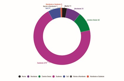 Regiões de origem dos/as/xs artistas participantes dos editais e do prêmio analisados, considerando-se somente aquelxs que viviam/trabalhavam no Brasil ou se dividiam entre o país e outro, mas indicavam as regiões brasileiras em que viviam