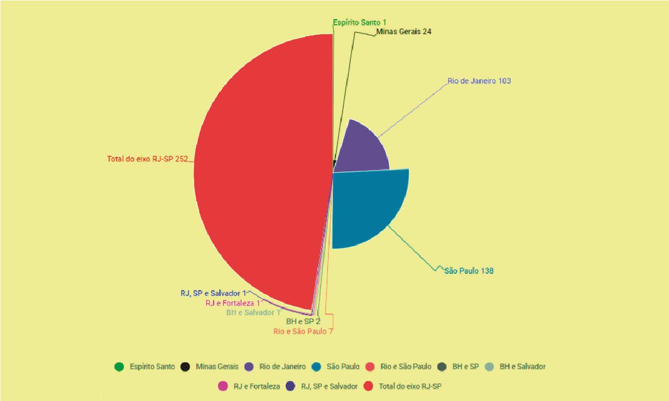 MARCONDES, 2019.Cidades do sudeste brasileiro em que viviam/trabalhavam os/as/xs artistas participantes dos editais e do prêmio analisados, considerando-se somente aquelxs que viviam/trabalhavam no sudeste ou se dividiam entre o país e outro, mas indicavam as cidades brasileiras em que viviam