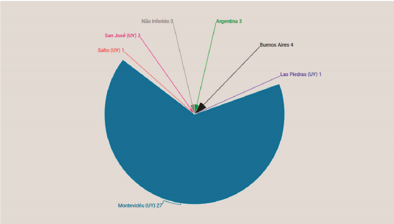 Apesar das distinções demográficas entre os países[14], da diferença de periodicidade das mostras analisadas e, por conseguinte, do conjunto total de biografias resumidas analisadas em cada caso, estes são dados que contam a história de ambos países, com seus circuitos artísticos específicos. Mesmo assim, é possível dizer que o perfil de jovens artistas selecionados/as/xs e premiados/as/xs pelos eventos artísticos analisados no Uruguai não se diferencia muito do caso brasileiro, acima apresentado; sendo o perfil de jovens artistas uruguaios/as/xs o seguinte: artistas entre 25 e 35 anos (Gráfico 7); nascidos/as/xs e mesmo residentes na capital do país, Montevideo (Gráfico 8); e, em sua maioria, homens (Gráfico 9)[15].