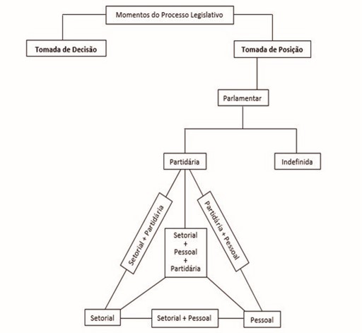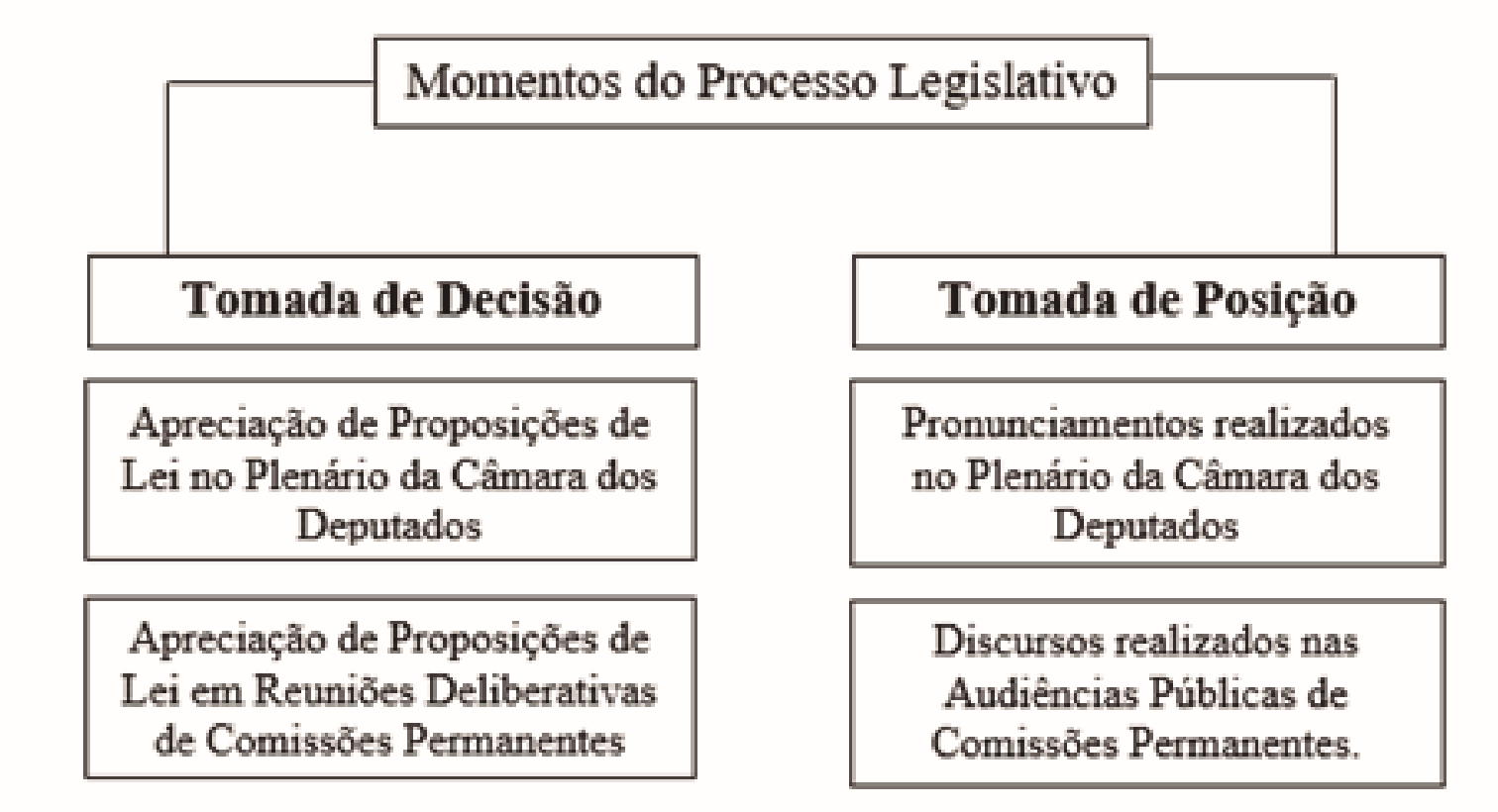 A tomada de posição precisa ser entendida como um momento do processo legislativo que é independente, mas interconectado com a tomada de decisão. A tomada de posição é aqui entendida como um momento em que os parlamentares sinalizam um posicionamento – debatem, discutem, questionam e confrontam outros agentes políticos por meio de um discurso, um momento no qual podem jogar o jogo político com mais liberdade. Estas tomadas de posição podem ser observadas quando os parlamentares realizam seus pronunciamentos no Plenário da Câmara dos Deputados ou quando realizam discursos dentro das audiências públicas realizadas nas Comissões Permanentes que compõem a Câmara dos Deputados. A tomada de decisão, por sua vez, é a altura do processo legislativo em que os agentes políticos firmam um posicionamento por meio do voto, manifestam uma decisão em momentos como as Apreciações de Proposições de Lei, em Plenário ou dentro de Reuniões Deliberativas que acontecem nas Comissões Permanentes.