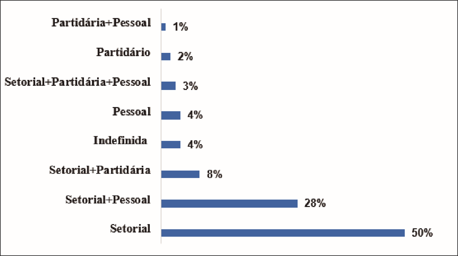 Um parlamentar pode ressaltar os interesses de um setor específico e, ao mesmo tempo, demonstrar que esses interesses também fazem parte da agenda defendida pelo seu partido (Setorial+Partidária). Uma tomada de posição também pode realçar a defesa de determinado setor e, concomitantemente, salientar interesses pessoais daquele parlamentar (Setorial+Pessoal). De modo semelhante, um deputado pode destacar a trajetória de seu partido em relação com a ideia defendida e, ao mesmo tempo, versar a respeito da sua trajetória pessoal e política (Partidária+Pessoal). Não raro, os parlamentares também podem ignorar a tensão existente entre os três tipos e mobilizar argumentos partidários, setoriais e pessoais.