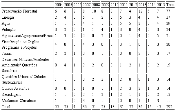 Durante o período analisado (2004-2015), a CMADS realizou 292 audiências públicas. A fim de compreender com mais clareza e objetividade as matérias que orientaram essas audiências e buscar uma possibilidade de recorte analítico, optamos por classificá-las e agrupá-las em 12 categorias, capazes de facilitar a percepção do que, em geral, predomina nos debates promovidos pela CMADS – esse processo foi realizado a partir da análise documental dos relatórios anuais disponibilizados pela Comissão. Cada audiência pública foi analisada a fim de se identificar qual era o assunto abordado. A Tabela 1 apresenta detalhadamente os dados a respeito desta classificação temática[8]. Entre as temáticas admitidas nessa análise, uma destaca-se fortemente perante as demais: a preservação florestal. A ocupar o segundo lugar como temática mais abordada, aparece a questão energética, seguida pelas discussões sobre a água. Se somada a quantidade absoluta total das audiências públicas realizadas nesses três grandes grupos temáticos (preservação florestal, energia e água), obtém-se quase 50% das audiências públicas realizadas durante todo o período estudado.