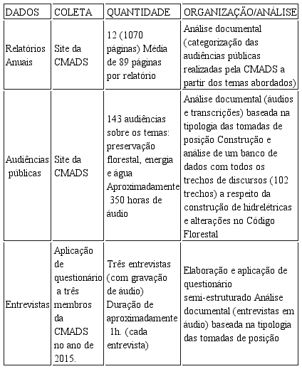 Os trabalhos desenvolvidos pelos estudos legislativos tradicionais, ao analisar as tomadas de decisão, mobilizaram modelos de análise predominantemente quantitativos. Acreditamos, entretanto, que a mudança de matriz teórica obriga a realizar desdobramentos metodológicos de ordens quantitativa e qualitativa que possam sustentar a tipologia criada. Desse modo, a coleta de dados e a análise demandaram que se investisse na triangulação de dados, com o intuito de utilizar a convergência de fontes para garantir rigor metodológico à pesquisa. Portanto, recorremos a três fontes de dados: (1) áudios das audiências públicas realizadas pela CMADS, (2) relatórios anuais da CMADS e (3) entrevistas com membros da CMADS[6]. Dada a natureza dos dados, foi importante combinar análise documental e entrevistas. A análise documental foi a principal técnica adotada, utilizada para tratar dois grupos de dados referentes a documentos oficiais: os áudios [e transcrições] das audiências públicas e os relatórios anuais da CMADS. Essa análise documental seguiu uma orientação classificatória, de acordo com a tipologia proposta. Em relação às entrevistas, um recurso complementar nessa investigação, foram aplicados questionários semiestruturados a três parlamentares que compuseram a CMADS e seu conteúdo também foi analisado com base na tipologia[7].