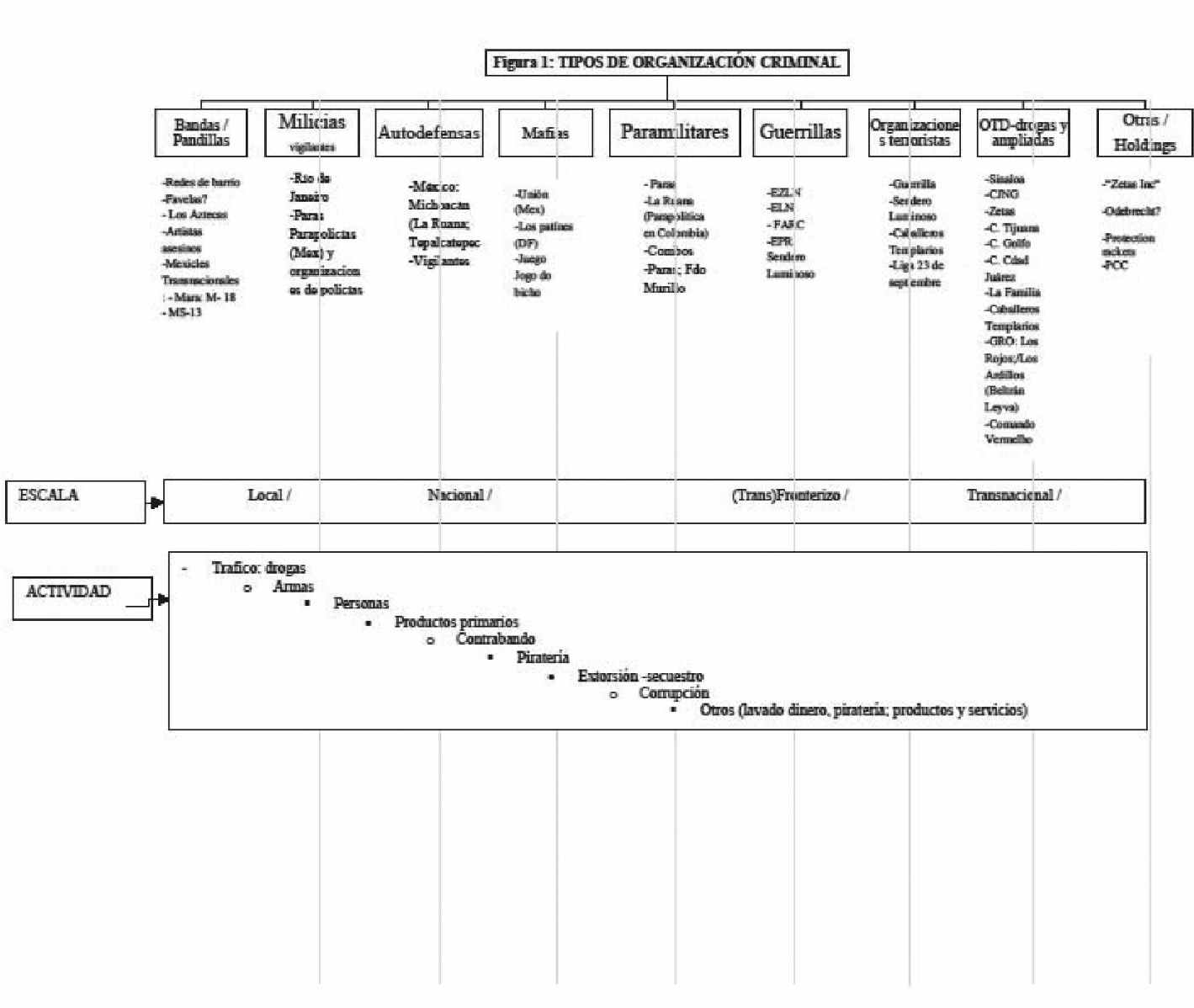 Como apreciará el lector, la figura cubre nueve tipos de organización criminal que son relativamente diferentes en sus propósitos; tienen distinta escala, forma, actividad, continuidad, número de miembros, capacidad de fuego y financiera. Todas pretenden obtener algún beneficio para sus agremiados; utilizan los mismos recursos; comparten varios rasgos de organizaciones del crimen que afectan la economía (regional e internacional), a las estructuras políticas y las sociedades donde asientan sus acciones predatorias y combaten. La gran mayoría son organizaciones armadas y utilizan la violencia de formas explícita. Algunas son organizaciones de origen “barrial” con ligas familiares, vecinales, cercanas, que utilizan la confianza interpersonal para facilitar las transacciones (o la cohesión o el capital social para sustentar la eficacia de sus prácticas); o carcelarias, mientras que otras requieren grados crecientes de organización, división y jerarquía en las operaciones, planeación, gerencia y ejecución a través de una elaborada organización del trabajo (interno). Algunas son centralizadas, otras son federaciones, o redes o franquicias.