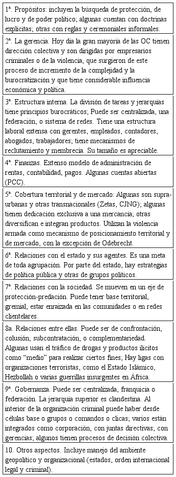En todo caso consideramos que la categoría propuesta de organizaciones criminales es un avance frente a la de CO porque reconsidera sus principales dimensiones y agrega otras que comprenden y explican mejor las nuevas compañías.