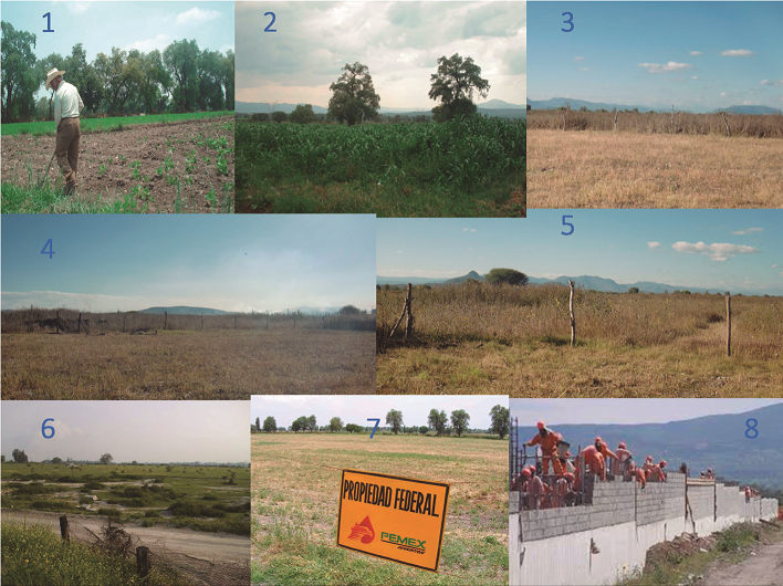 1) Trabajando la tierra, 2) Cultivo de tierra, 3) Tierra sin uso, 4), 5), 6), 7), 8) Obras del proyecto.