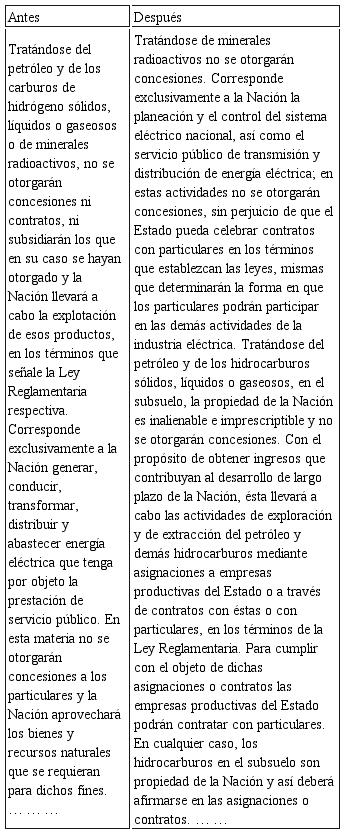 [...] El caso del petróleo y los carburos sólidos, líquido e hidrógeno gaseosos, no serán concedidas concesiones y contratos, ni subsistirán los que hayan sido concedidos y que el país llevara la exploración de esos productos en los términos establecidos por la ley de reglamentación respectiva (Artículo 27 de la Constitución Mexicana).
