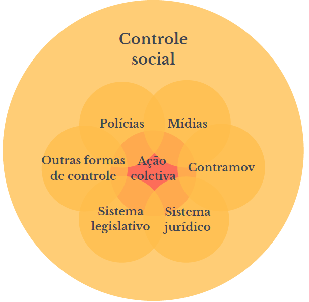 No campo da ação coletiva essa definição implica que, ao mesmo tempo em que há indivíduos e grupos cuja ação objetiva mudanças sociais e o questionamento da ordem instituída, em oposição, há um conjunto de indivíduos e grupos voltados para controlar a ação dos primeiros. Nas disputas em torno da mudança ou da manutenção da ordem, o Estado é um ator central, o que se traduz em instituições coercitivas como as polícias. Essas representam, porém, a faceta mais evidente do controle estatal. Outros campos, como o jurídico e o legislativo, conformam o aparato estatal voltado para o controle social (Barkan, 2006; Oliver, 2008). Atores e grupos não estatais, como contramovimentos e mídias, podem também atuar para a manutenção da ordem social. Destacam-se, ainda, modalidades mais difusas e informais de controle, como a violência privada exercida cotidianamente contra minorias sociais.