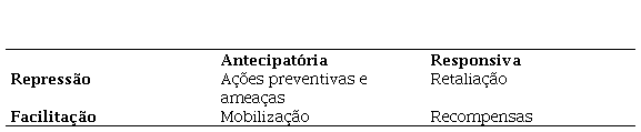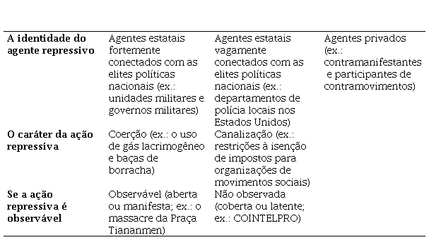 Earl (2011, p. 263, tradução própria), por seu turno, propõe o seguinte conceito de repressão: “uma ação estatal ou privada dirigida a prevenir, controlar ou constranger a ação coletiva não institucional (exemplo: protesto), incluindo sua iniciação”. Para caracterizar essas diferentes dimensões da ação repressiva, Earl (2003, p. 47) cria a seguinte tipologia: