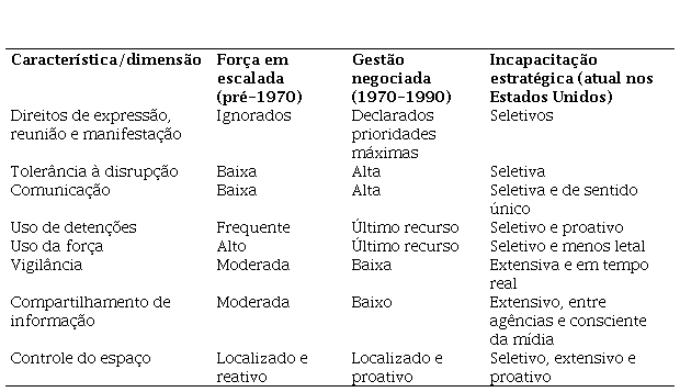 A tendência à configuração de estratégias policiais mais tolerantes e moderadas, porém, não se mantém no período contemporâneo. A insuficiência da estratégia de gestão negociada tem sido relacionada às características específicas dos protestos do Movimento por Justiça Global (Gillham, 2011). Tais protestos, organizados por uma nova geração de ativistas, desafiam os princípios da gestão negociada na medida em que fazem uso extensivo de ações diretas e disruptivas e são constituídos por grupos heterogêneos, sem uma liderança formal definida, que se recusam a negociar com as autoridades policiais. A resposta policial às características desse evento é o desenvolvimento de um modelo policial de “incapacitação estratégica” (Gillham, 2011; Gillham, & Noakes, 2007).