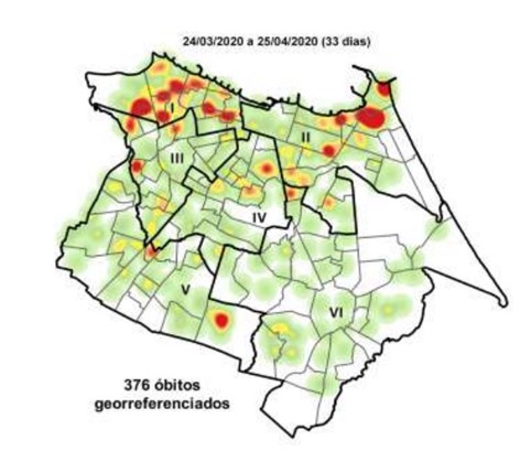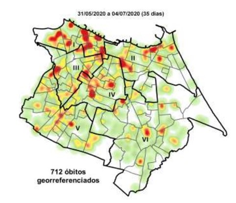 Como se pode notar no Mapa 6, da distribuição espacial dos 376 óbitos nas primeiras cinco semanas epidemiológicas, esses casos ocorreram em bairros de alto e muito alto IDH, mas já se observa o início da dispersão do vírus para bairros mais vulneráveis, destacados no mapa anterior.