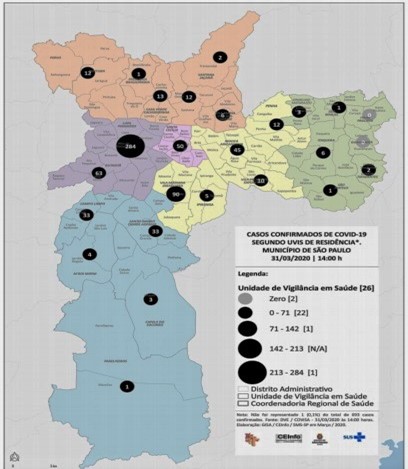 A análise da distribuição regional dos casos mostra que a Unidade de Vigilância em Saúde Lapa/Pinheiros apresentou o maior número de casos, 284, seguida da Vila Mariana/Jabaquara, com 90. São regiões centrais com elevado padrão socioeconômico, sugerindo que esta incidência de casos estaria relacionada aos casos importados e seus comunicantes.