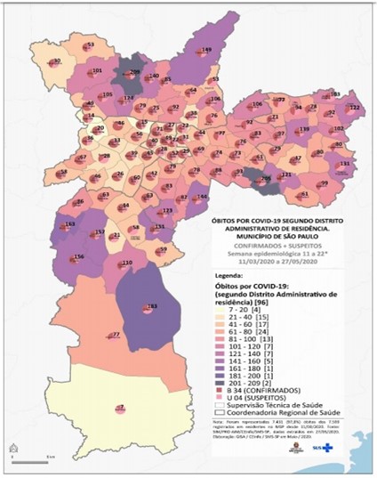 Os Distritos Administrativos de Brasilândia (CRS Norte) e Sapopemba (CRS Sudeste) apresentaram o maior número de óbitos até 27/05/2020, seguidos pelos Distritos Administrativos Grajaú, Capão Redondo, Jardim São Luís e Jardim Ângela (CRS Sul), com 183, 163, 157 e 156 óbitos, respectivamente.