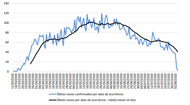 No dia oito de agosto de 2020, Fortaleza registrava um total de 43.850 casos confirmados e 3.736 óbitos. No entanto, a média móvel9 de novos óbitos em Fortaleza foi de duas mortes por dia. A capital cearense alcançou, por duas semanas seguidas, menos de 10 óbitos diários em decorrência da Covid-19. Contrário ao argumento do Governo Federal, o lockdown, que se estendeu por todo o mês de maio, demonstrou sua efetividade, evitando mortes.