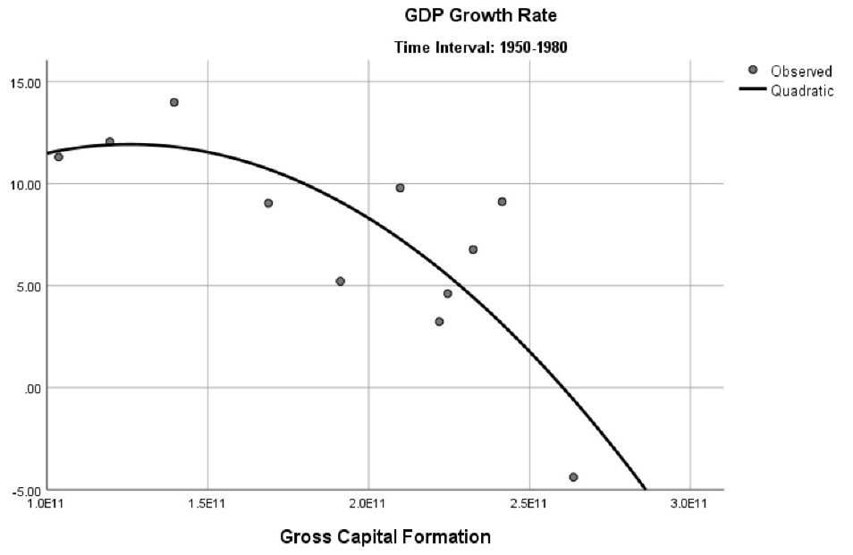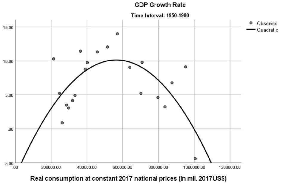 To grasp the growth rate’s behavior from a longer-term perspective and its relation to real consumption as a proxy for the domestic market’s weight, Figures 1, 2, and 3 illustrate how real consumption explains the growth rate in three different periods. As in Figure 1, for the period between 1950 and 1980, the real consumption explains 35% of the variance in GDP growth rate. In Figure 1, a quadratic curve expresses this relation, not a linear one; that is, real consumption increases even when growth rates are lower.9