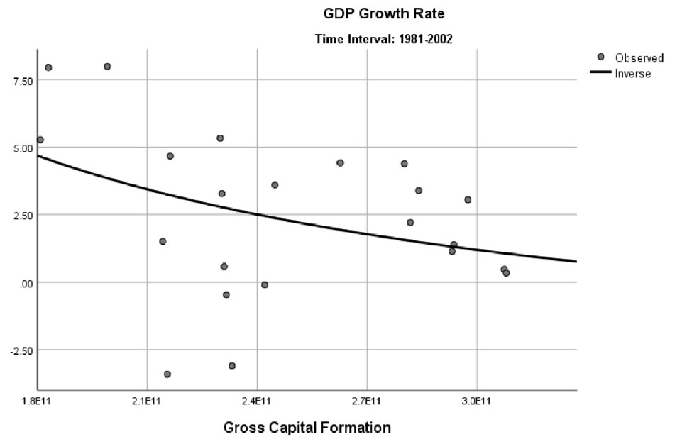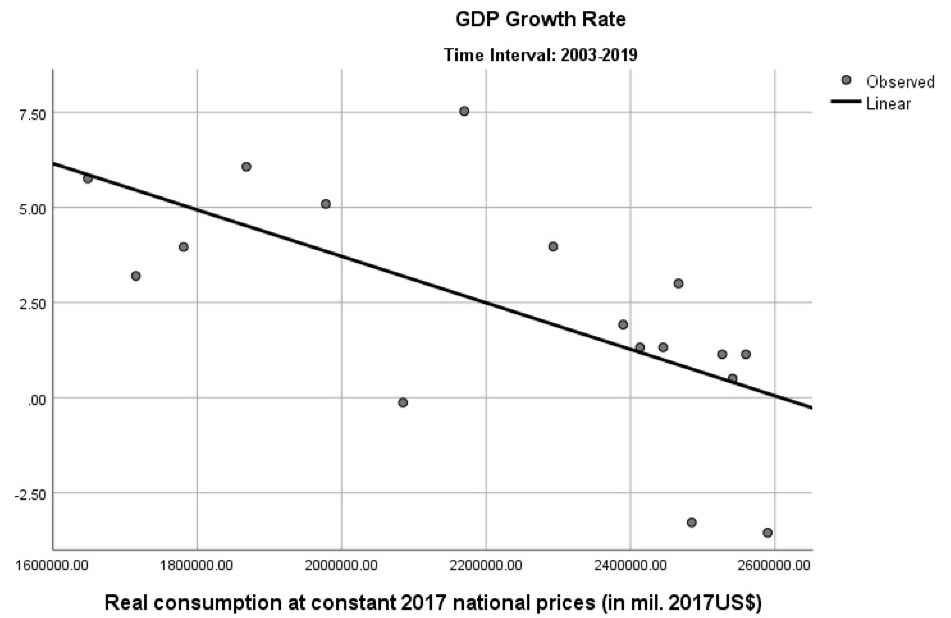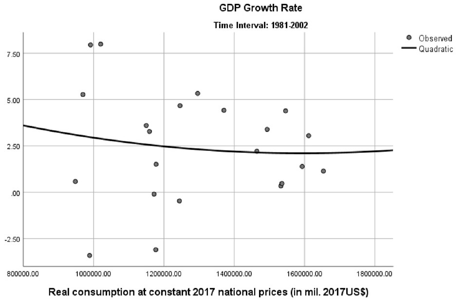 However, when the growth rate is plotted with real consumption for the period 1981-2002, there is no meaningful relationship between the two variables. As shown in Figure 2, there is a large dispersion of data points. The curve shows how uncorrelated are the variables of growth rate and real consumption. Also, the variation of the growth rate is higher than in the previous period.10