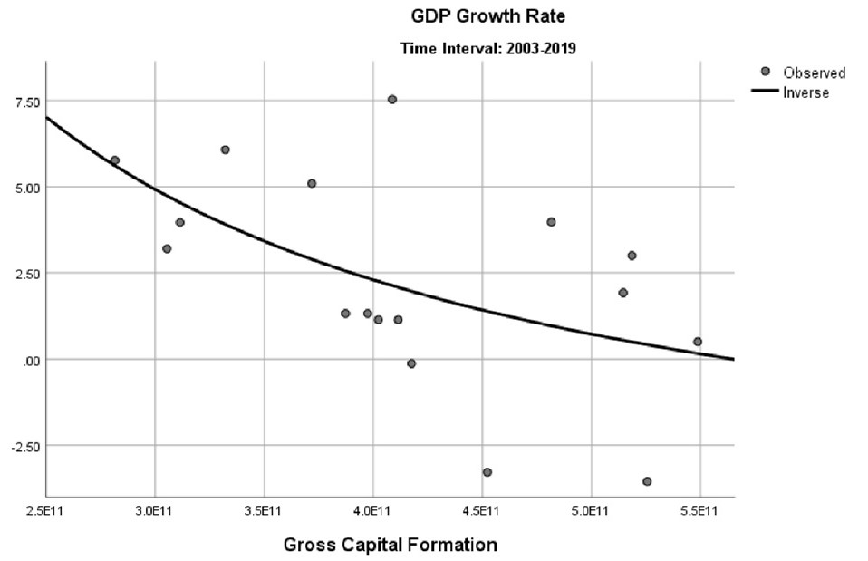 These investment rates contrast with the share of gross capital formation of South Korea, whose average share is 38% of the GDP between 1981 and 2002 and 35.2% between 2003 and 2019. From a comparative capitalism perspective, this is a less closed economy with much less protectionism. Between 1981 and 2002, Brazil’s trade openness went from 19% of the GDP to 27.6%. In the period between 1960 and 1980, the gross capital formation’s investment rate in constant US dollars explains 55.6% of the GDP growth variance. The standardized coefficient for gross capital formation is positive (1.7) so that a larger amount of investment is positively associated with a larger growth rate (Figure 4).