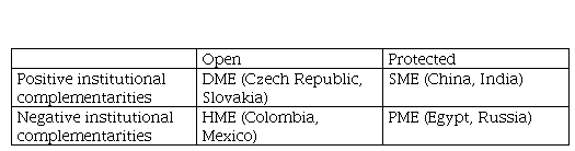 Simultaneously, CC research has identified varieties of capitalism that systematically lead to suboptimal rates of economic growth resulting from negative institutional complementarities. Since the end of the Import Substitution Industrialization (ISI), middle-income countries in Latin America failed to develop institutions to promote sustained economic growth like their Asian counterparts. Schneider (2013) mentions a Hierarchical Market Capitalism (HME) variety. with negative institutional complementarities. However, one must be cautious to put all Latin American countries into the same basket, because industrialized countries such as Mexico, Brazil, and Argentina have a diverse economic structure which does not fit well into an overarching type of Latin American capitalism. In contrast, more successful cases of economic growth for emerging markets consist of the dependent market economy (DME) type found in Central Europe and the state permeated economy (SME) type, most prominently found in China (Nölke & Vliegenthart, 2009).