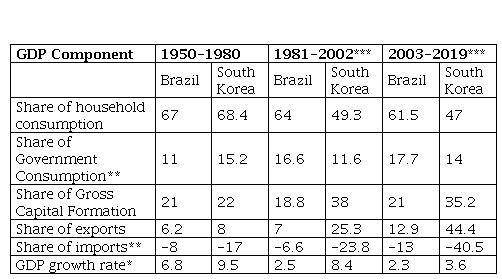 In 1980, Brazil’s GDP per capita was two thousand dollars, virtually equal to the South Korean GDP of 1.7 thousand dollars. The growth rates were similar, but also the rate of investment with an average of 20% of the GDP. Both Brazil and South Korea were remarkably similar in the GDP components share between 1950 and 1980, as shown in Table 2.