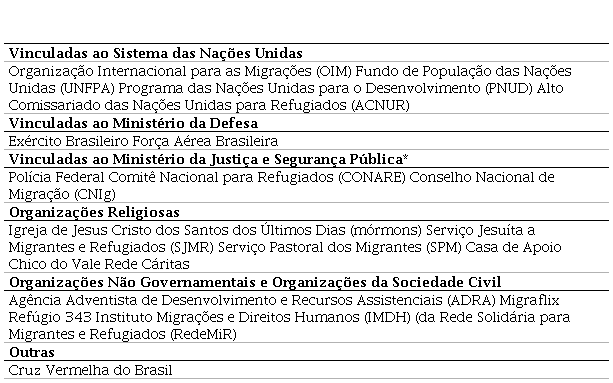 Algumas dessas OSCs estão envolvidas na interiorização de venezuelanos, que faz parte da “Operação Acolhida”, oficialmente, de caráter temporário, coordenada pela Casa Civil da Presidência da República, com a participação de dezesseis ministérios, das Forças Armadas e, como já mencionado, agências do sistema ONU. Essa “operação” envolve o Exército, a Marinha e a Aeronáutica e norteia-se por três frentes de atuação: ordenamento de fronteira, abrigamento e interiorização (Vasconcelos, 2020).