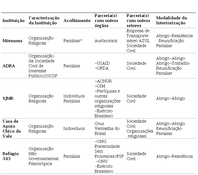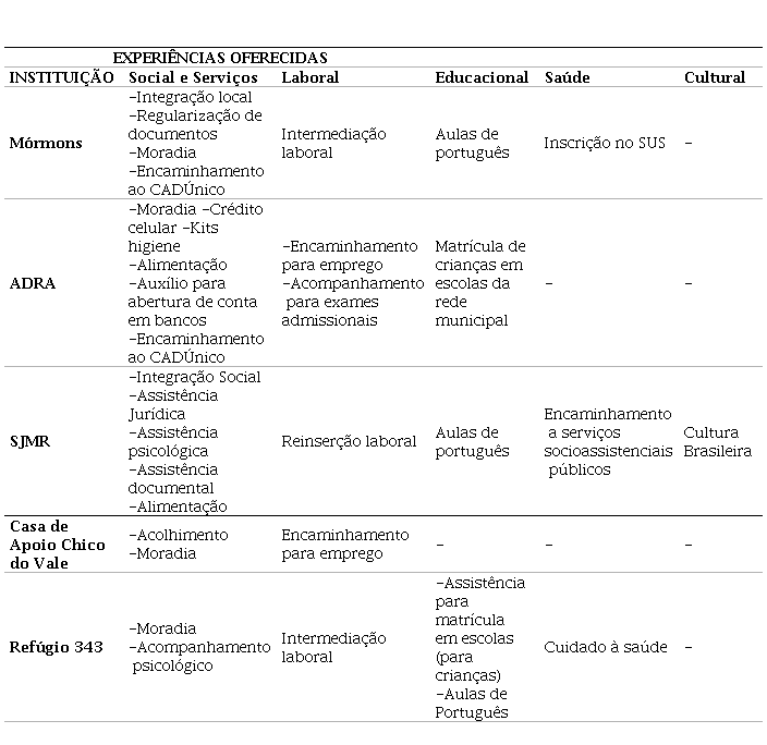 As instituições mencionadas, de forma autônoma ou em parcerias, oferecem serviços, auxílios e assistência a famílias e indivíduos venezuelanos, em condição de refúgio ou residência temporária, proporcionando a estes a possibilidade de iniciar uma nova vida, com menor impacto e melhor condição de integração social.
