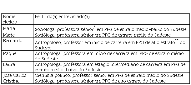 Para este artigo, selecionamos sete entrevistados que eram professores em programas de pós-graduação, de um total de quatorze docentes de ensino superior que participaram do projeto. Essa amostra combina diferentes gerações e vinculações institucionais, com professores que são pesquisadores CNPq em programas nota 7 e docentes em atuação em programas tidos como emergentes. Essa diversidade nos pareceu fundamental para iluminar mais adequadamente os achados do survey.