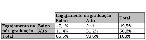 A tabela 2 sintetiza a distribuição do grau de engajamento dos entrevistados tanto para a graduação (valores na coluna), quanto para o engajamento na pós-graduação (valores na linha). A partir desta tabela podemos identificar a representatividade dos quatro grupos. O primeiro reúne 31,2% dos docentes que possuem engajamento “alto” nos dois níveis de docência. Membros desse grupo valoram de forma parecida o trabalho nos dois níveis de atuação.