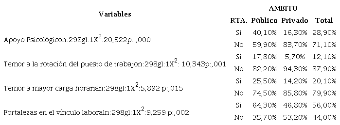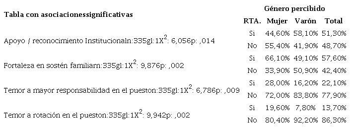 Con respecto a la variable que remite al género, se verificó la relación entre sexo y apoyo/reconocimiento institucional (mayor en varones), fortaleza en la familia (mayor en mujeres), temor a tener más responsabilidad en el puesto (mayor en mujeres) y temor a rotación en el puesto (mayor en mujeres). Según nuestra lectura, los temores aluden a la fragilidad laboral del puesto y las fortalezas relativas al ámbito personal-familiar (Tabla 4).