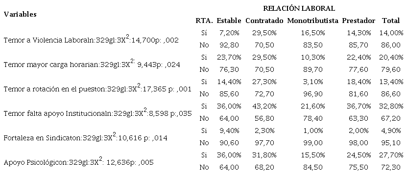 Con respecto a los cruces entre relación laboral y temores/fortalezas, se corroboró asociación significativa con las variables de temor a violencia laboral, apoyo psicológico, temor a la rotación del puesto, temor a la falta de apoyo institucional, temor a mayor carga horaria y fortalezas en el sindicato. Los profesionales más precarizados (contratados y prestadores) mostraron mayor probabilidad a contestar afirmativamente sobre los temores a la violencia laboral, la sobrecarga horaria y la falta de apoyo institucional. En tanto el plantel estable demostró probabilidad mayor de contar con fortalezas en el sindicato y apoyo psicológico (Tabla 2).
