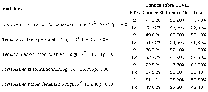 Con respecto a la variable “conoce Covid”, los resultados significativos vuelven a girar en torno a la autorresponsabilidad y las posibilidades individuales de hacer frente a la pandemia. Hay asociación entre conocimiento y contar con información actualizada, así como conocer sobre el tema se vincula a la fortaleza en la formación propia. En tanto los que menos conocen sobre COVID tienen mayor temor al contagio personal y a que la situación se torne incontrolable. También este último grupo encuentra más apoyo en sus vínculos familiares (Tabla 3).