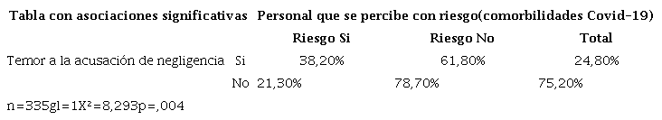 Aproximadamente un cuarto de las personas encuestadas manifestó temor a ser acusado de mala praxis. Profesionales que se perciben como grupo de riesgo (por presentar alguna comorbilidad) tienen mayor probabilidad de expresar este temor con respecto al grupo de los encuestados que se manifestaron como población sin riesgo(Tabla 5).