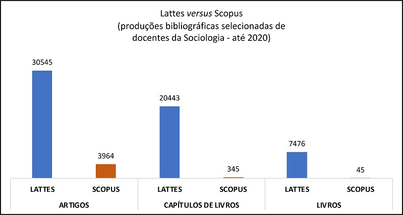 Comparando o volume de produção bibliográfica de artigos, capítulos de livros e livros dispostos na base Scopus e no Currículo Lattes – realizada a partir da coleta exclusiva de registros bibliográficos oriundos dos docentes selecionados do campo da Sociologia no Brasil, até 2020 – é possível perceber a discrepância de informações disponíveis entre ambas as plataformas (Gráfico 1).