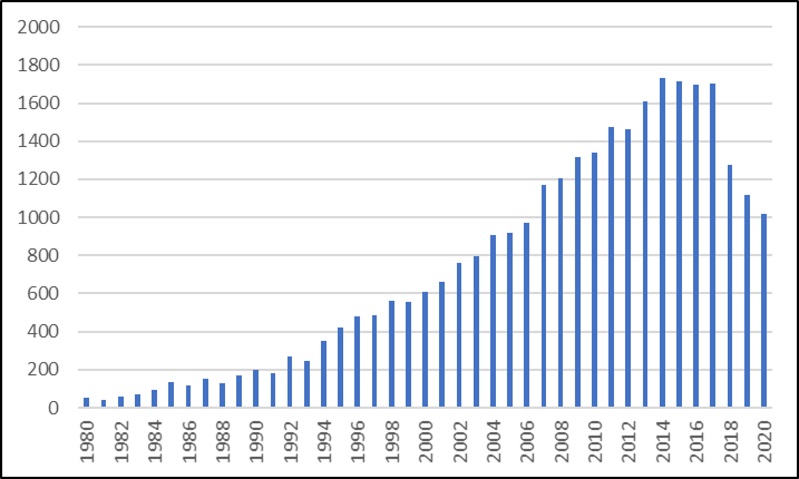 Os Gráficos 2, 3 e 4 apresentam a mesma informação: artigos publicados em periódicos (entre 1980 e 2020) pela coorte de docentes do campo da Sociologia selecionados, porém categorizados e demonstrados de formas distintas. Aqui é importante esclarecer que a origem geográfica do artigo foi baseada na localização da instituição de ensino e pesquisa a que o docente estava vinculado no ano de 2020.
