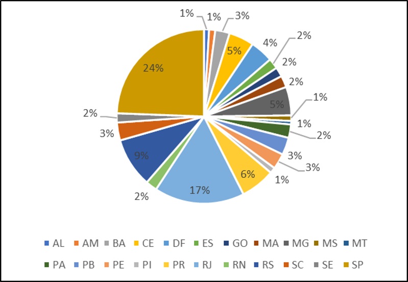 Assim, utilizando o arcabouço técnico associado aos procedimentos de compilação e análise dos currículos Lattes presentes no pacote getLattes, é possível obter indicadores de atividades científicas como, por exemplo, o volume da produtividade bibliográfica de artigos científicos do campo da Sociologia ao longo do tempo (Gráfico 2) e a distribuição dessa mesma produção a níveis regional e estadual (Gráficos 3 e 4, respectivamente).
