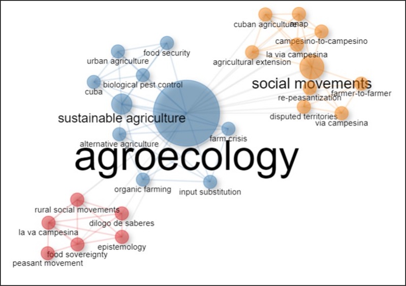 Entretanto, o indicador de citação – mesmo limitado a um dado número de registros – apresenta resultados que sugerem tópicos de interesses da área do conhecimento examinada. A partir do cálculo de frequência de termos-chave dos autores dos artigos selecionados, é possível observar a proeminência de temas de pesquisa. Analisando especificamente o conjunto de registros bibliográficos mais citados globalmente, disponíveis no Quadro 3, foi possível identificar que o tema “agroecology” (agroecologia) é o mais recorrente, seguido de “social movements” (movimentos sociais), e que podem ser visualizados no Grafo 1.