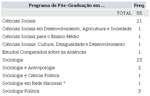 O escopo deste artigo foi definido considerando o levantamento de identificação de docentes vinculados aos Programas de Pós-Graduação (PPGs) realizado pela CAPES e disponibilizado pelo Sistema de Disseminação de Informações (SDI), coletado em 2020. Desse levantamento, foram selecionados todos os 55 PPGs avaliados na área de Sociologia. Desse montante foi resgatado um total de 1.310 docentes ativos1 em suas funções. O campo considerado está apresentado nas Figuras 1 e 2.