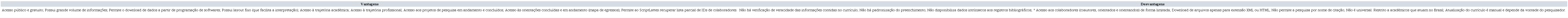 O CNPq permite que os dados contidos no currículo sejam baixados e analisados por terceiros desde que a finalidade do uso da informação seja para o desenvolvimento de indicadores e/ou aprofundamentos de políticas científicas e tecnológicas (CNPq, 2019).9 O Quadro 1 sintetiza vantagens e desvantagens em utilizar o Currículo Lattes como banco de dados bibliográfico.