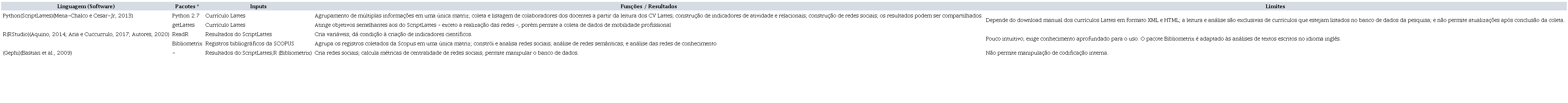 Os softwares adequados para análises cientométricas e construção e análise de grafos de colaboração científica são os estatísticos e bibliométricos. Neste subitem serão apresentados os limites e oportunidade de três softwares comumente utilizados para finalidades cientométricas: ScriptLattes, R e Gephi, que se complementam em suas funções. Trata-se de programas livres, ou seja, gratuitos (não onerando o analista e/ou a instituição) e que possuem licenças de uso abertas aos usuários. O Quadro 2 sintetiza o conjunto de informações sobre as ferramentas tecnológicas dedicadas à cientometria.