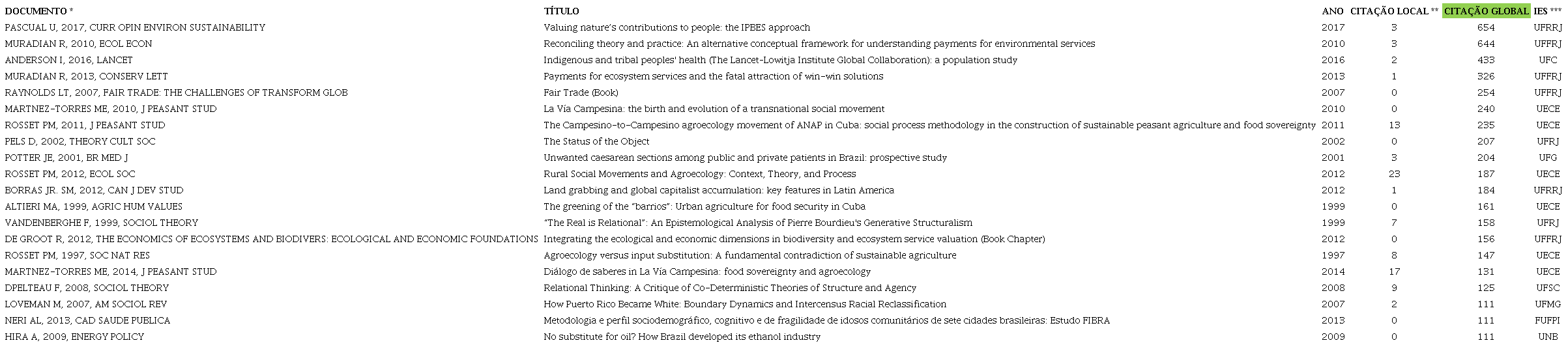 Scalon e Miskolci (2018) já haviam confirmado a tendência positiva da internacionalização da produção científica sociológica ao longo do tempo, a partir de análises da plataforma Scival, vinculada à base Scopus. Para os autores (2018, p.128) a internacionalização, em termos de publicação, está relacionada ao processo de divulgação do trabalho acadêmico em veículos com conselhos, políticas editoriais e audiências efetivamente globais. O resultado deste artigo concorda com os achados de Scalon e Miskolci (2018) e avança na identificação das temáticas – de interesse internacional – que ocupam patamares de destaque no meio sociológico brasileiro. Com base nessa observação das publicações mais globalmente citadas, a subárea da Sociologia Rural e temas correlatos à agroecologia e agroeconomia despontam nesse cenário internacional.