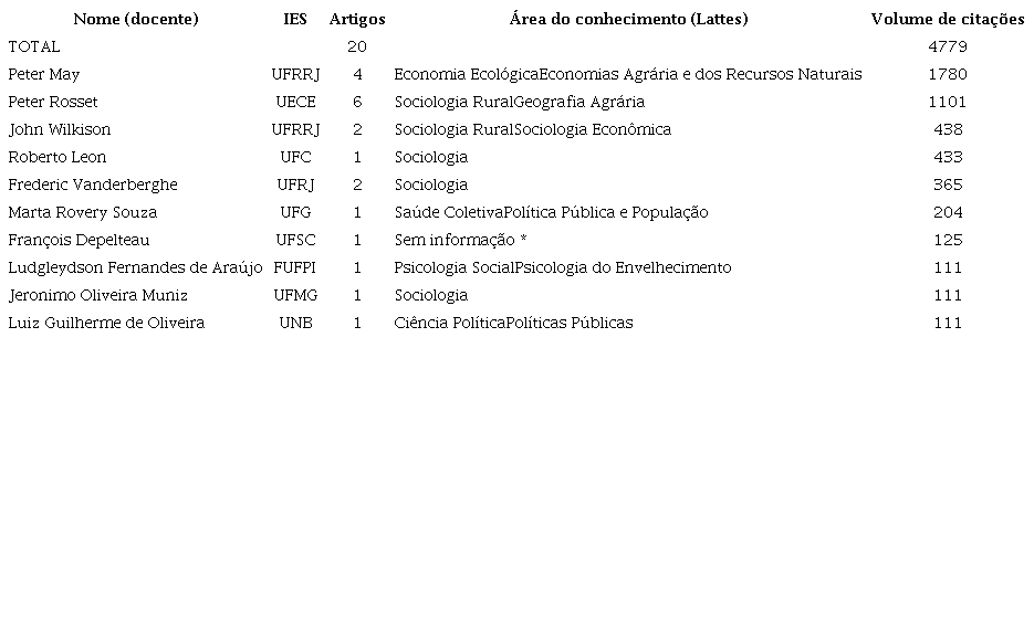 O resultado evidencia uma multiplicidade de identidades acadêmicas, sugerindo, por um lado, a diversidade científica associada ao campo da Sociologia e, por outro, a preeminência da subárea de Sociologia Rural dentre os artigos mais bem colocados a nível internacional – dentro do escopo da base de dados Scopus e a partir do parâmetro da citação.