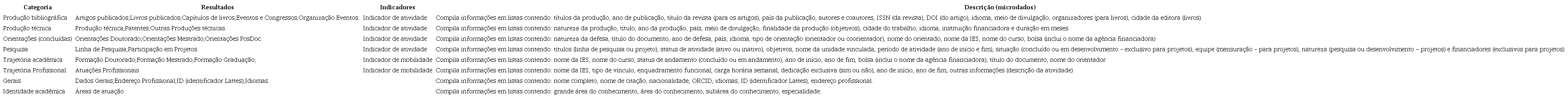 De acordo com Mena-Chalco e Cesar Junior (2013), os currículos Lattes são considerados um padrão nacional de avaliação, representando um histórico das atividades científicas, acadêmicas e profissionais de pesquisadores cadastrados na Plataforma Lattes. Os autores (2013) entendem que os currículos foram projetados para mostrar informações públicas e individuais e salientam que a compilação de produções bibliográficas de grupos de usuários “requer um grande esforço manual suscetível a falhas”. O pacote getLattes (Souza e Sabino, 2020), vinculado ao software R, permite o processamento e análise de currículos Lattes previamente baixados. O Quadro 5 sintetiza e categoriza todos os resultados que podem ser alcançados a partir do uso da ferramenta “getLattes”.